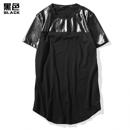 Flat Summer New Men's Round Neck Short-Sleeved High Street Arc Hem Solid Color Leather T-Shirt